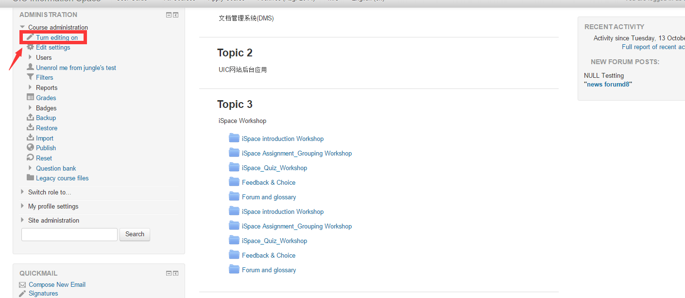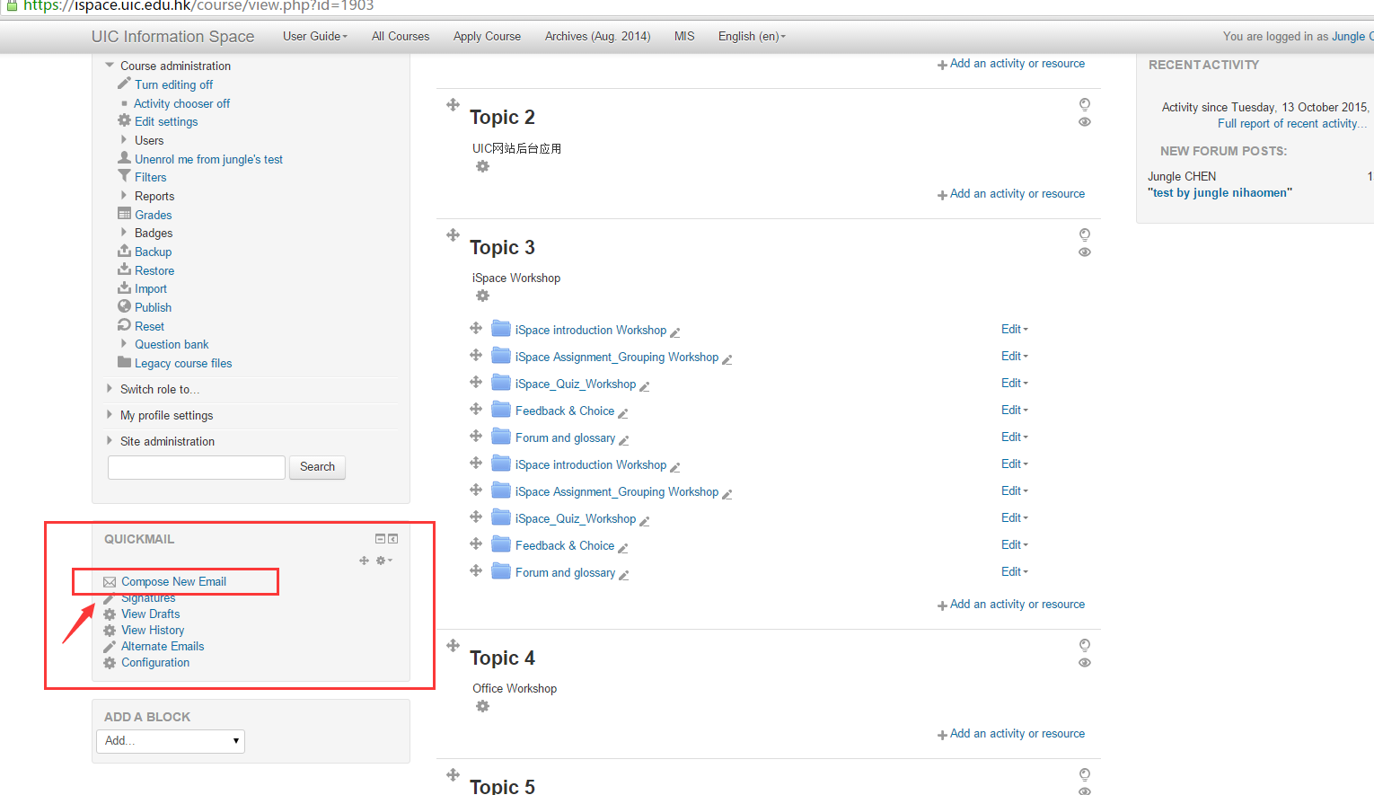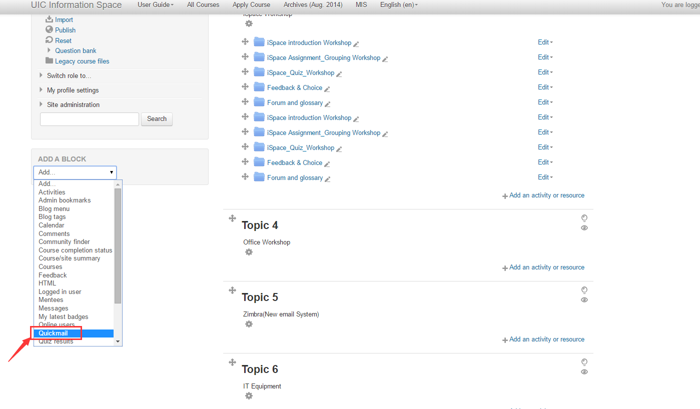 2 Scroll to the bottom of the right column to ‘ADD A BLOCK’. Choose ‘Quickmail’ from the dropdown menu