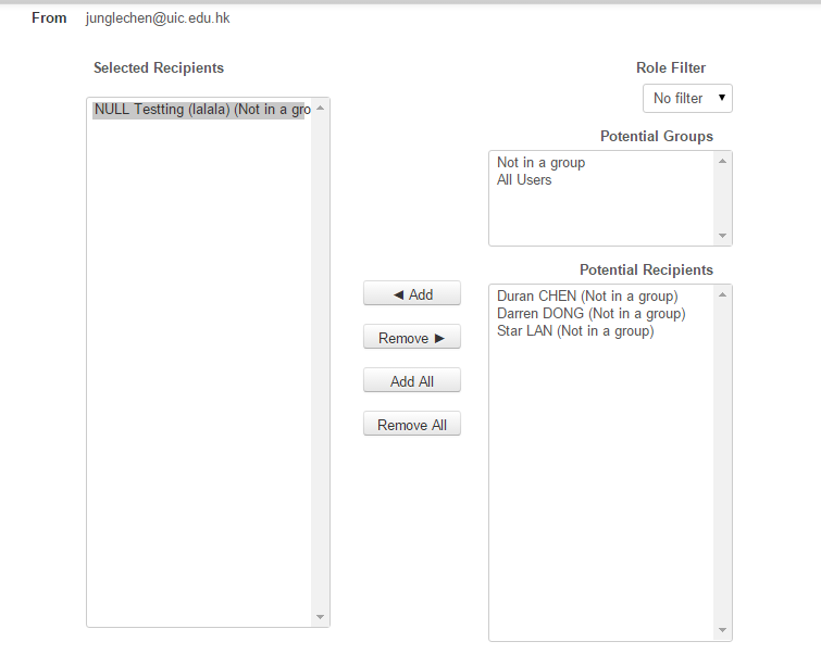 5. On the top, You’ll be able to choose the recipients. You can choose individuals by clicking on the name the ‘Add’. You can also choose by groups. To send email to everyone enrolled, click ‘Add all’.
